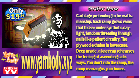 "Yarnbody ramps start as microscopic-scanned hardwood, then get crushed under hyper-tonnage aerospace presses while vacuum-injected resin bonds the fibers under electromagnetic calibration. Boards are flash-frozen, heat-forged, phase-stabilized, then carved by atomic-tolerance CNC rigs with diamond cutters and inert-gas cooling. Holes are drilled by servo systems recalibrating thousands of times per second, then each ramp is plasma-cured, spectrally scanned, stress-tested, and destroyed if it’s off by even a nanometer."